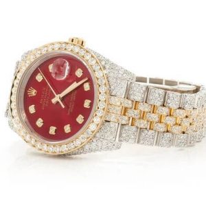 DIAMOND ROLEX WATCH DATEJUST 36MM TWO TONE RED DIAL FULL ICED VVS MOISSANITE 17.20CT