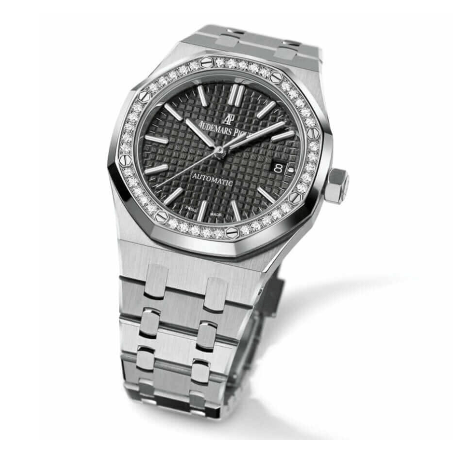 The Audemars Piguet Royal Oak 15451ST.ZZ.1256ST.01 replica is a luxury watch. The case is made of 904L stainless steel and is 37.00 mm in size with a thickness of 9.80mm. The bezel is also made of 904L stainless steel and is gem-set. The crystal is a sapphire and the bracelet is a Royal Oak bracelet made of 904L stainless steel with adjustable links.