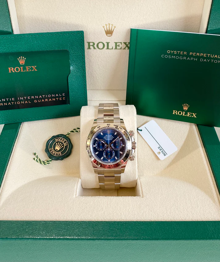 Rolex Daytona Cosmograph (116509) self-winding automatic watch, features a 40mm 18k white gold case surrounding a blue dial on an 18k white gold Oyster bracelet with folding buckle.