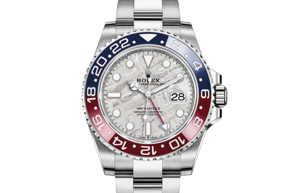 This model is the only GMT-Master II with a meteorite dial. Meteorite comes from the heart of an asteroid or possibly even a planet that has exploded, propelling material across the Solar System until chance brings it into our planet?s orbit and gravity pulls it to Earth. During its journey, the centre of the meteorite is gradually transformed, producing highly unusual metallic patterns, resulting from the very slow cooling of molten asteroid cores. The designers at Rolex create from these configurations a unique treasure for some of the most prestigious models, including this GMT-Master II.