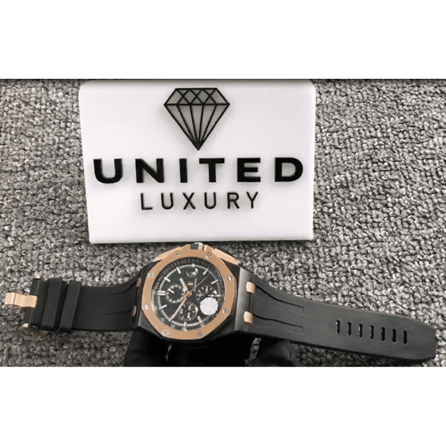 The Audemars Piguet Royal Oak Offshore 26406FR.OO.A002CA.01 replica is a luxury watch. It features a 904L stainless steel case with a pink gold. ceramic. and carbon color. The bezel is made of stainless steel and is also pink gold. The sapphire crystal is 44.00 mm in size and 14.45 mm in thickness. The bracelet is made of rubber and is adjustable for all sizes. It has a 904L stainless steel fold clasp in pink gold