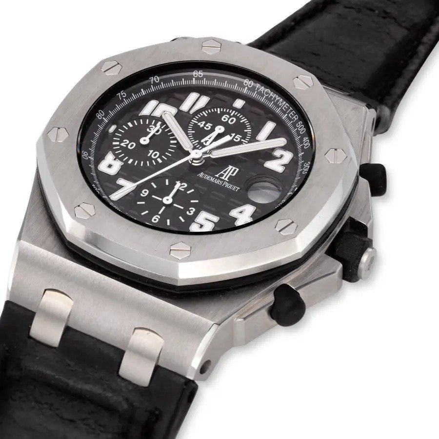 This Audemars Piguet Royal Oak Offshore Chronograph replica watch (model no. 25940SK.OO.D002CA.02) is a perfect 1:1 clone of the original. It features a 904L stainless steel case and bezel. with a sapphire crystal and a black rubber bracelet. The movement is an automatic caliber 2226/2840 with a 60-hour power reserve and a precision of (-3/+3 sec/day) within COSC certification limits. The dial is black with Arabic numerals and 904L stainless steel hour markers and hands.