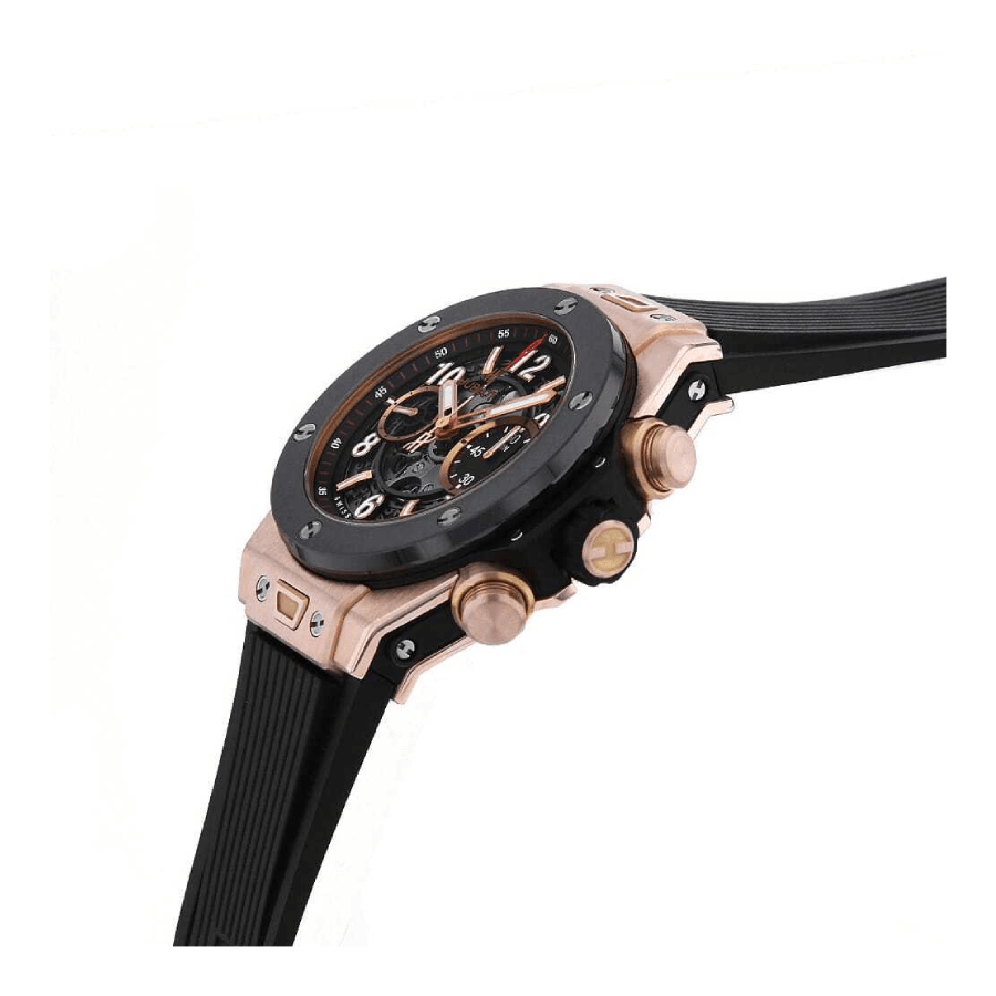 The Hublot Big Bang Unico King Gold Flyback Chronograph Skeleton 441.OX.1180.RX Skeleton Replica is a luxurious watch. It features a 904L stainless steel case with a rose gold color and a sapphire crystal. The movement is an automatic caliber HUB1240 with a power reserve of 60 hours and a precision of (-3/+3 sec/day) within COSC certification limits. The second hand has a sweep motion. The bracelet is made of rubber with adjustable links and a 904L stainless steel fold clasp in black and rose gold.