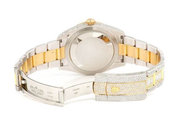 This iced out diamond watches Rolex DateJust is made of TwoTone and 42mm with 21.40ctw of Moissanite. This watch inside and out to Rolex quality standards.