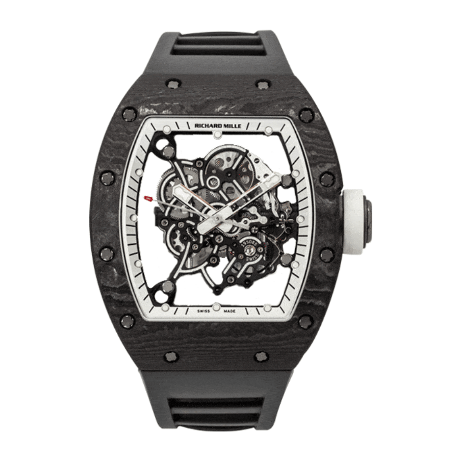 The Richard Mille RM055 Bubba Watson Replica is a luxurious watch with a sleek black design. It features an automatic movement with a caliber RM 55 and a power reserve of 60 hours. The precision of the watch is within COSC certification limits. with a sweep motion second hand. The case is made of 904L stainless steel and has a sapphire crystal. The bracelet is made of rubber and has adjustable links for all sizes. The dial is transparent with stick and dot indices. and the hands are made of 904L stainless steel.