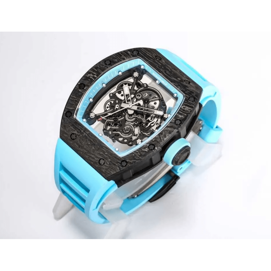 The Richard Mille RM 055 Yas Marina Circuit Replica combines sleek aesthetics with reliable performance inspired by the iconic Yas Marina Circuit. Featuring a durable 42mm x 50mm NTPT carbon case. this watch offers lightweight strength and a distinctive look. The skeletonized dial reveals the sophisticated manual movement inside. shielded by a scratch-resistant sapphire crystal for lasting clarity.