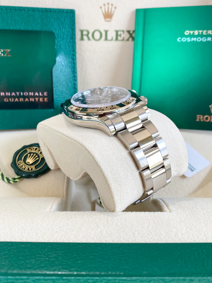 With its tachymetric scale, its three counters and its pushers, the Cosmograph Daytona was designed to be the ultimate timing tool for endurance racing drivers. The bezel features a tachymetric scale to read average speed over a given distance based on elapsed time. This scale offers optimal legibility, making the Cosmograph Daytona the ideal instrument for measuring speeds up to 400 units per hour, expressed in kilometres or miles.