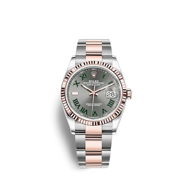 Unworn Rolex Datejust 36mm, Oystersteel and 18k Everose Gold watch. They have a Slate Dial, Green Roman Numerals hour markers. Minute markers around the outer edge and every 5 minutes are marked with Arabic numerals.?Highly legible Chromalight display with long-lasting blue luminescence. Monobloc middle case, solid screw-down case back, and winding crown. Scratch-resistant sapphire, Cyclops lens over the date. Date window located at the 3 o’clock position. The Fluted 18k Everose Gold bezel. The movement is mechanical self-winding, caliber 3235 with 31 jewels and 70 hours of power reserve. The Oyster bracelet of flat three-piece links is Stainless Steel and 18k Everose Gold. Folding Oysterclasp with Easylink 5mm comfort extension link. The water resistance is up to 100m/330ft. The Watch comes complete with store papers and box. Will include 3 years Store Warranty.