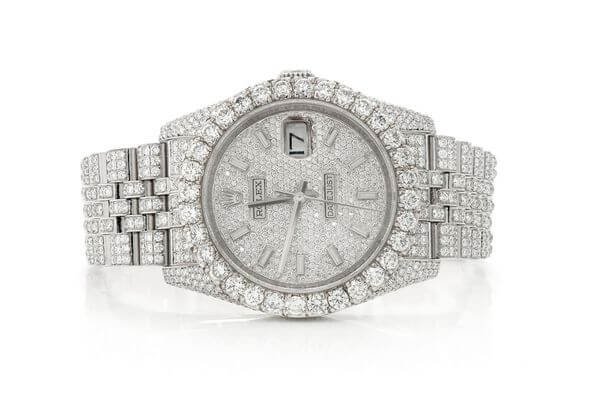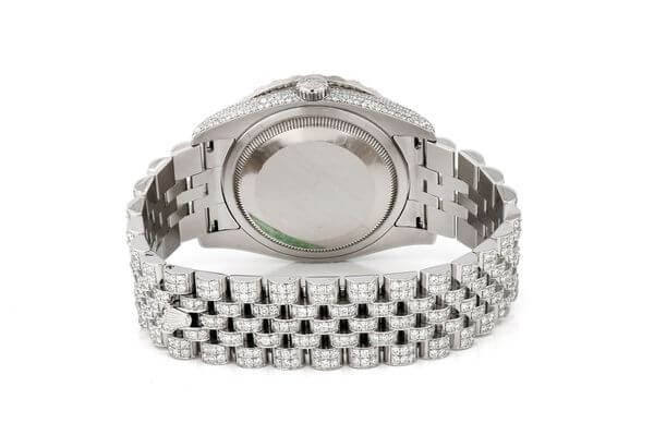 This Rolex DateJust is made of Silver and has a 36mm case size with 17.00ctw of Moissanite diamonds. Our expert watchmakers have serviced this watch inside and out to Rolex quality standards. This watch comes with an Rolex box.
