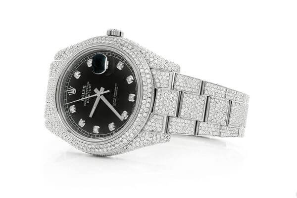 ROLEX DATEJUST ICED OUT 41MM SILVER BLACK DIAL AUTOMATIC STAINLESS STEEL WATCH FULL MOISSANITE 16.00CT