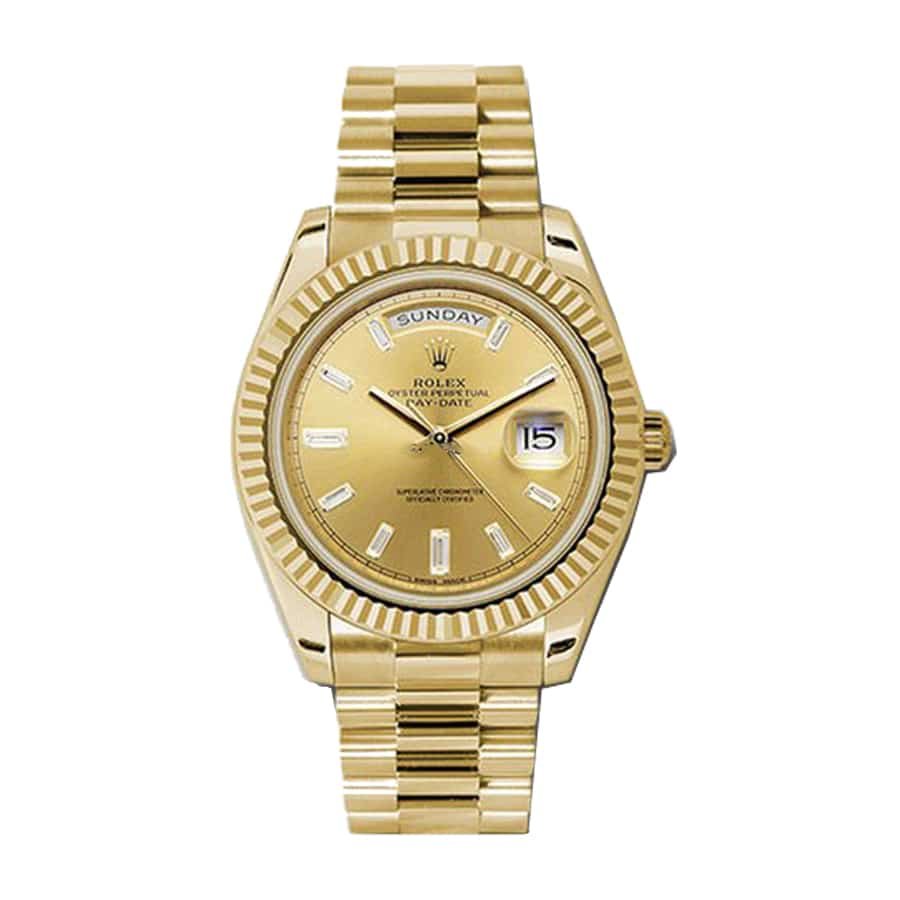 This Rolex Day-Date 228348RBR KW Yellow Gold & Diamonds Champagne Dial Replica is a stunning watch. It features an automatic movement with Rolex 3255 caliber and a power reserve of 60 hours. The case is made of 904L stainless steel and is 40.00 mm in size with a thickness of 12.00mm. The bracelet is also made of 904L stainless steel and is adjustable for all sizes. The dial is champagne in color with gem-set and stick indeces and 904L stainless steel stick hands. The watch is water-resistant and comes with a full 2 year international warranty.