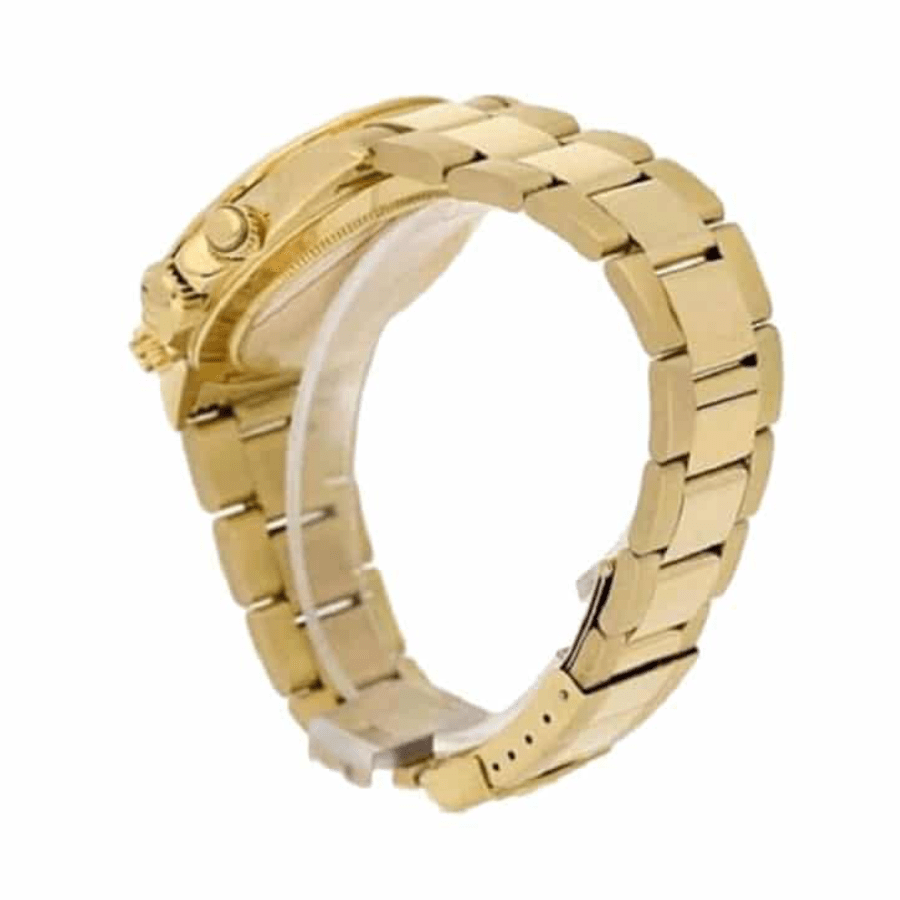 This Rolex Daytona Gold Tone White Dial 116523 Oyster Replica is a stunning watch. It features a 904L stainless steel case with a yellow gold color and a sapphire crystal. The movement is an automatic caliber 4130 with a power reserve of 60 hours and a precision of (-3/+3 sec/day) within COSC certification limits. The bracelet is also made of 904L stainless steel with an adjustable link and a fold clasp in yellow gold.