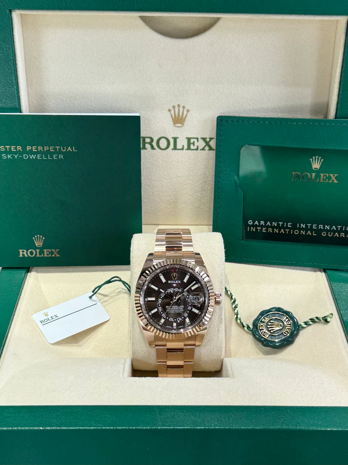 Unworn Rolex Sky-Dweller 330935-0006, 42 mm. The watch has Chocolate Dial. The Case is 18 ct Everose gold w/ 9001 Movement, 72 hours power reserve. The Bracelet 18 ct Everose gold with Folding Oysterclasp with Easylink 5 mm comfort extension link. The Water-resistant is up to 100 m. The Watch comes complete with Rolex Papers & Box. Covered with Rolex 5-Year Warranty.?