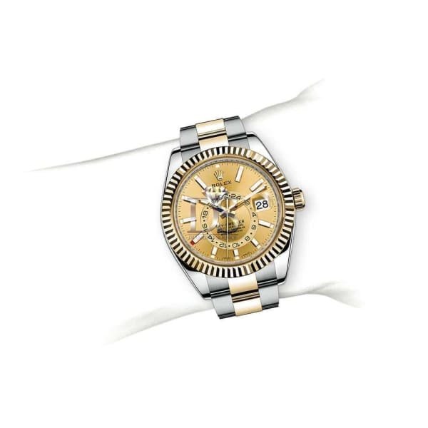 42mm yellow Rolesor case comprised of a 904L steel monobloc middle case, screw-down back, screw-down crown, 18K yellow gold fluted bezel with bidirectional rotatable Rolex Ring Command, scratch-resistant sapphire crystal with cyclops lens over the date and double anti-reflective coating, champagne dial, index hour markers, Rolex calibre 9001 automatic movement , second time-zone displayed via off-center rotating disc, Saros annual calendar with date at 3 o’clock and month indicated in discrete apertures at each of the 12 hour marks, stainless steel and 18K yellow gold Oyster bracelet, folding Oysterclasp buckle with Easylink 5mm comfort extension link. Waterproof to 100 meters. Watch label: Swiss Made.